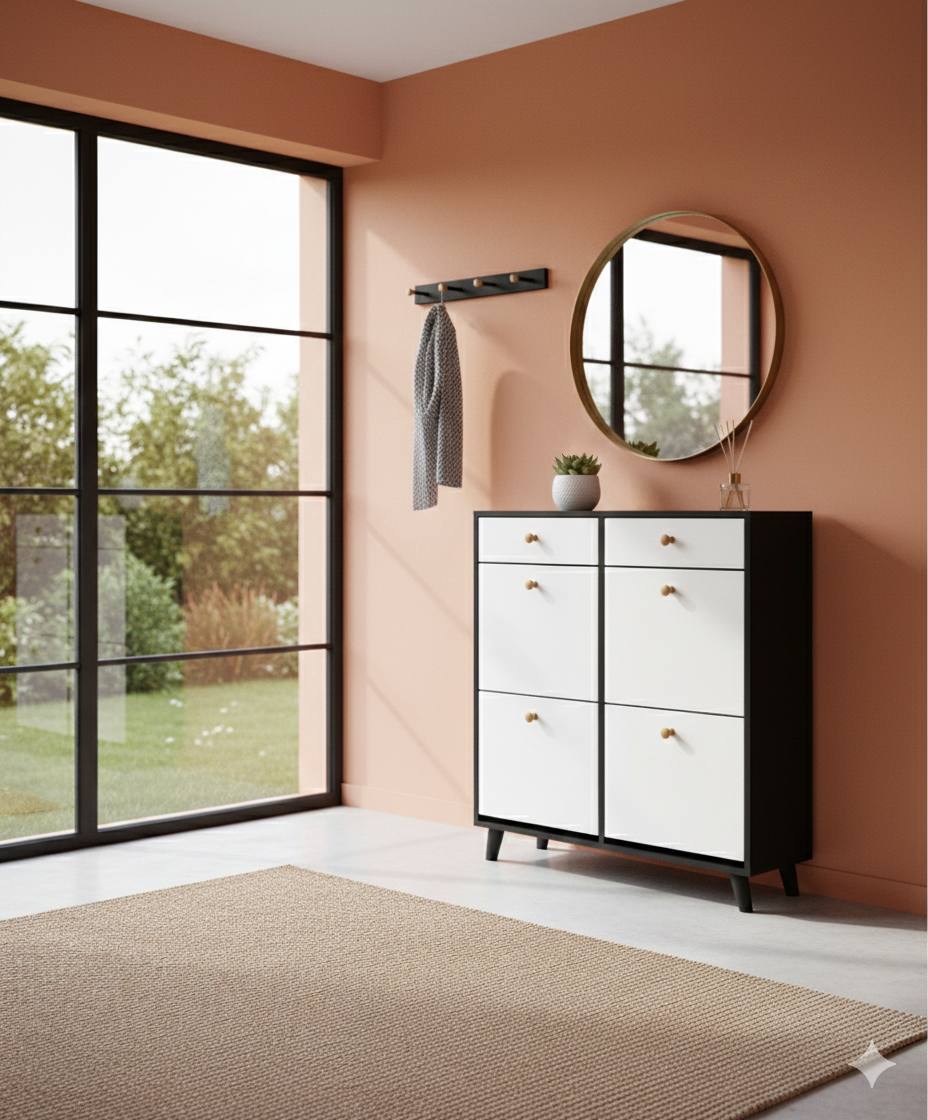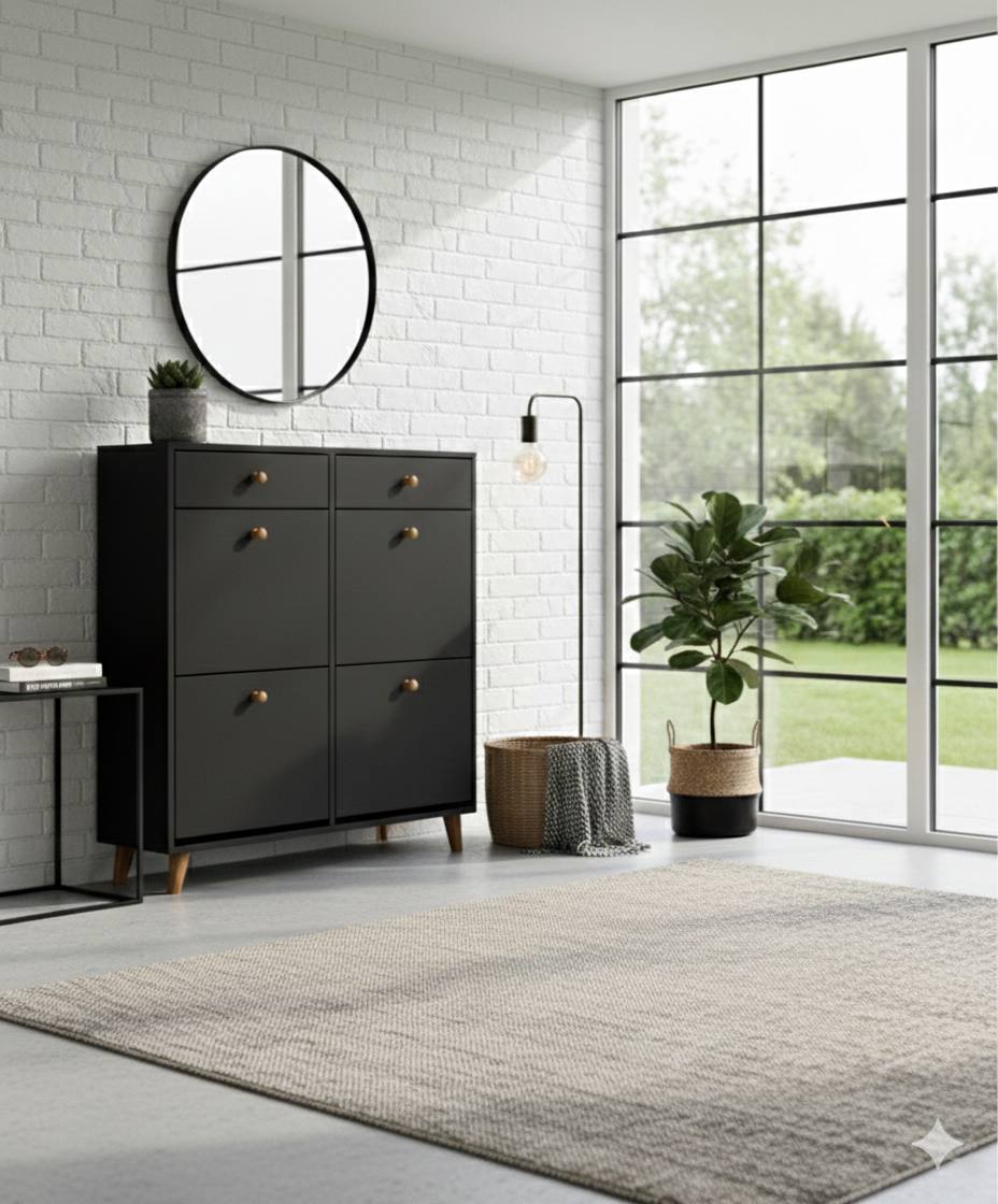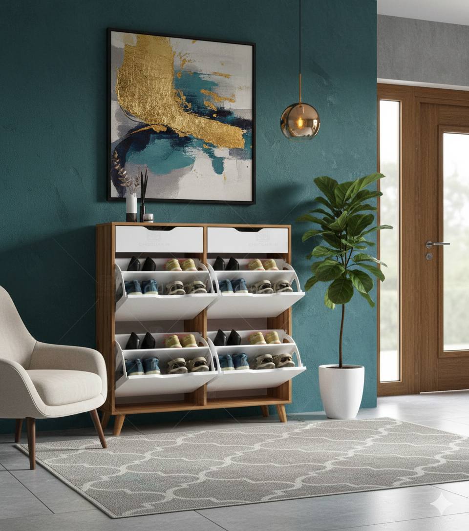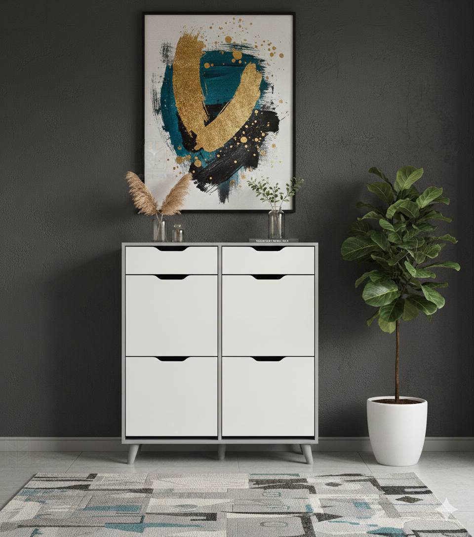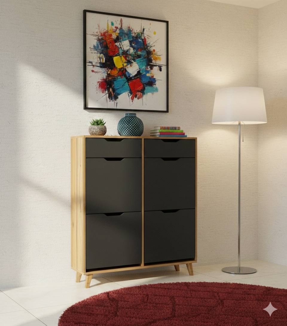 - • این جاکفشی دارای ۴ درب داشبوردی جا دار است که هر کدام توان نگهداری ۴ جفت کفش را دارند و در مجموع فضایی مرتب و منظم برای قرار دادن کفشها در اختیار شما قرار میدهند.