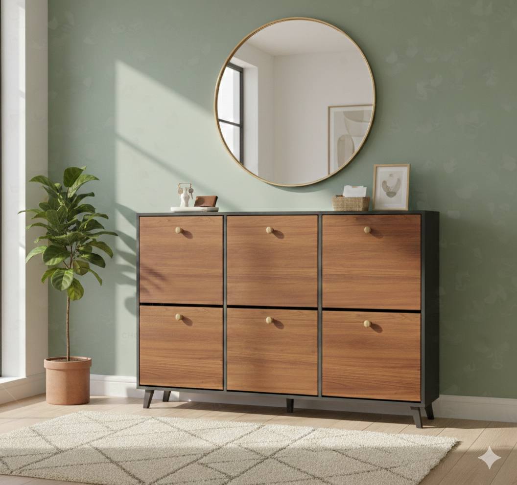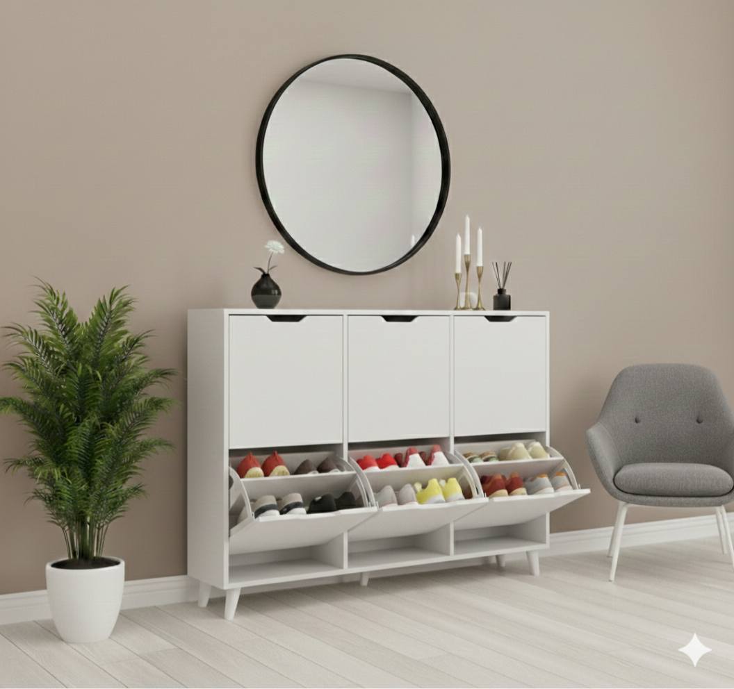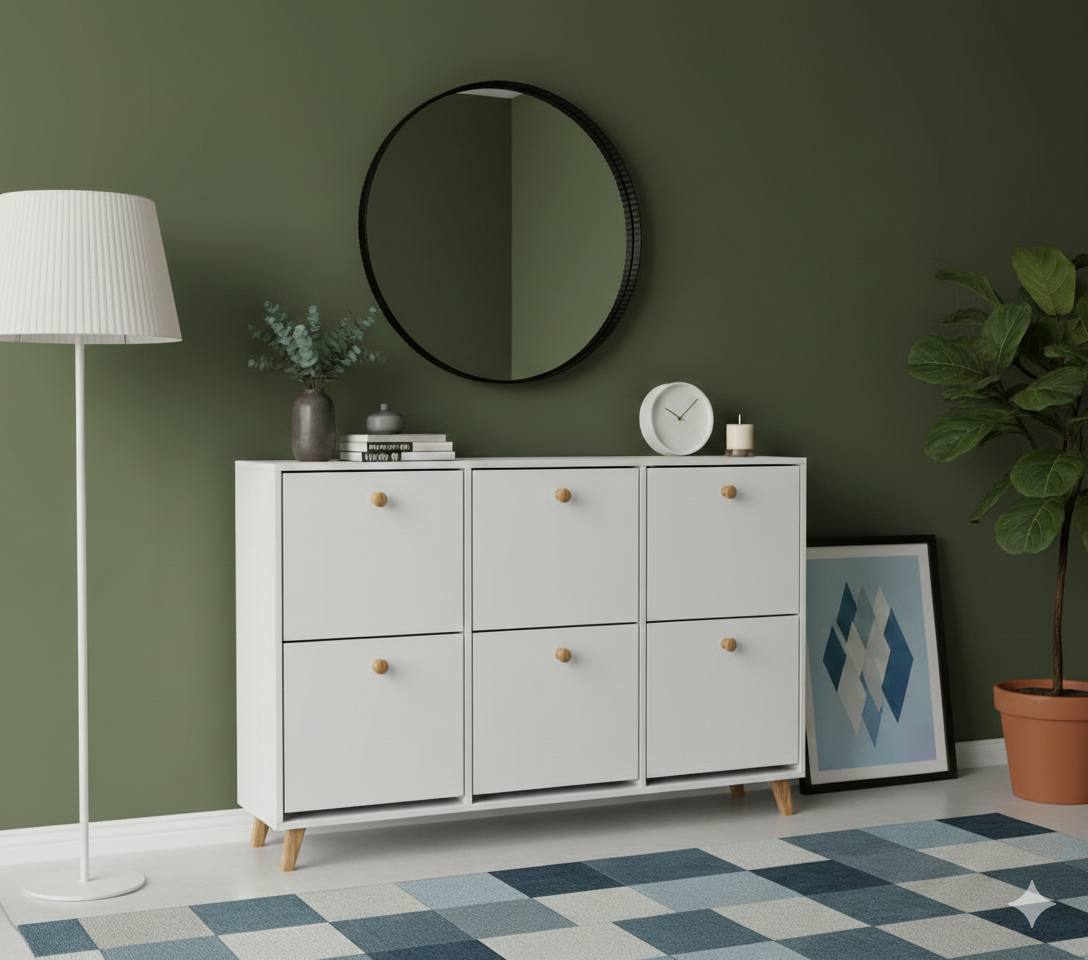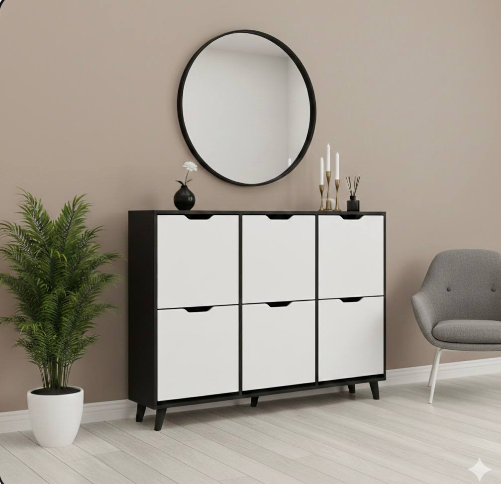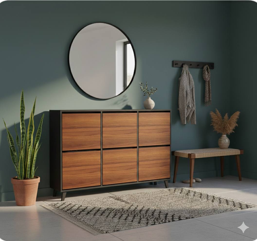 جاکفشی مدل روین با طراحی مدرن و کاربردی، گزینهای مناسب برای نظمدهی کفشها در فضای ورودی منزل است. این مدل دارای ۶ درب داشبوردی بوده و در مجموع ظرفیت نگهداری ۲۴ جفت کفش را فراهم میکند. طراحی شیک و ساده آن باعث میشود علاوه بر یک جاکفشی جادار، بتوان از آن به عنوان آینه کنسول در دکوراسیون ورودی خانه نیز استفاده کرد.
