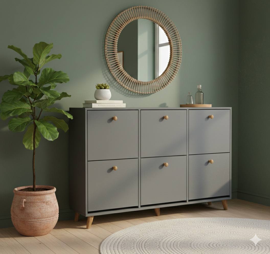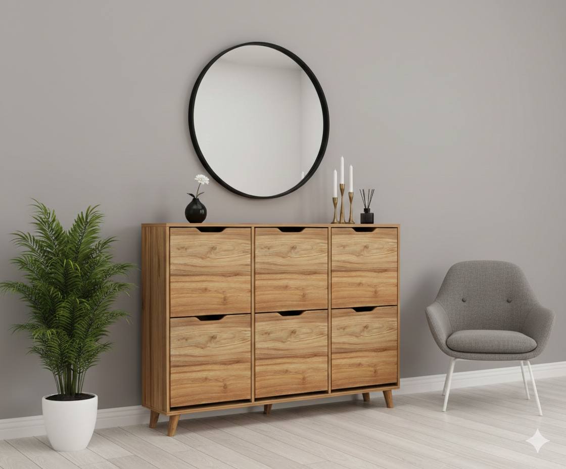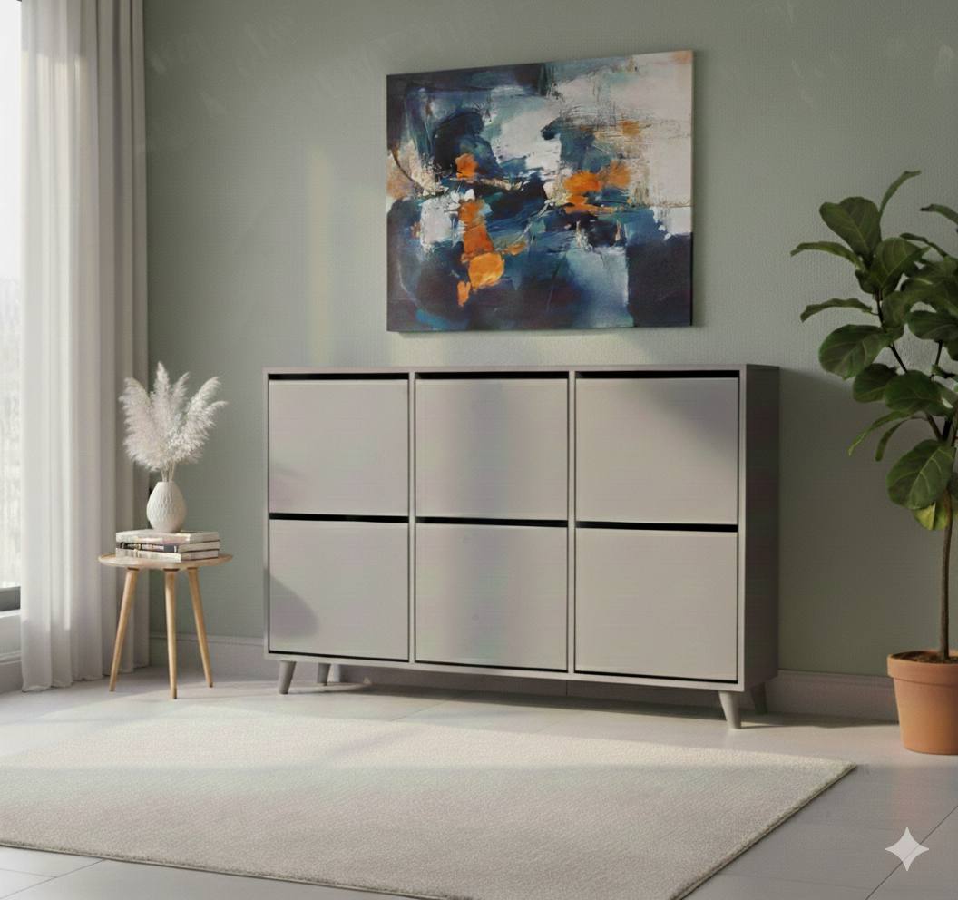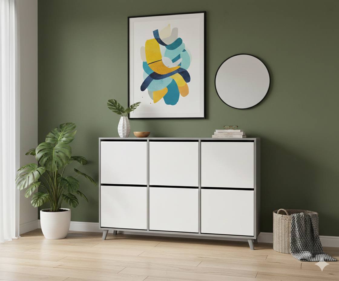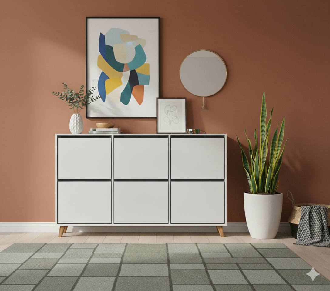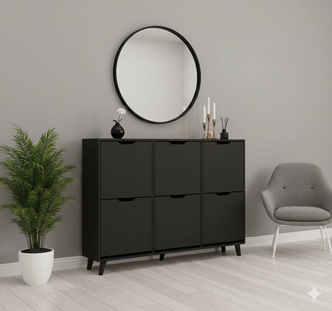 جاکفشی مدل روین با طراحی مدرن و کاربردی، گزینهای مناسب برای نظمدهی کفشها در فضای ورودی منزل است. این مدل دارای ۶ درب داشبوردی بوده و در مجموع ظرفیت نگهداری ۲۴ جفت کفش را فراهم میکند. طراحی شیک و ساده آن باعث میشود علاوه بر یک جاکفشی جادار، بتوان از آن به عنوان آینه کنسول در دکوراسیون ورودی خانه نیز استفاده کرد.