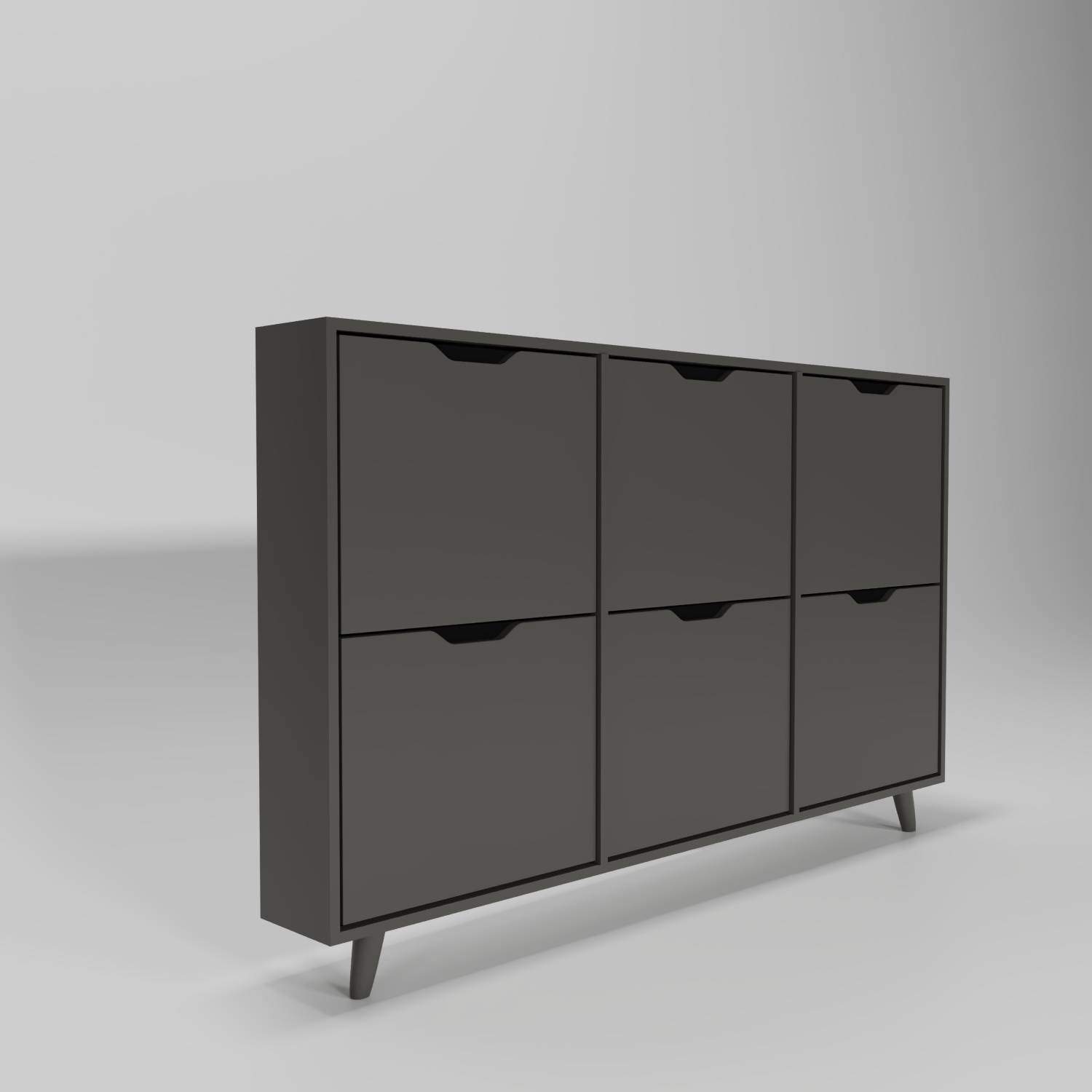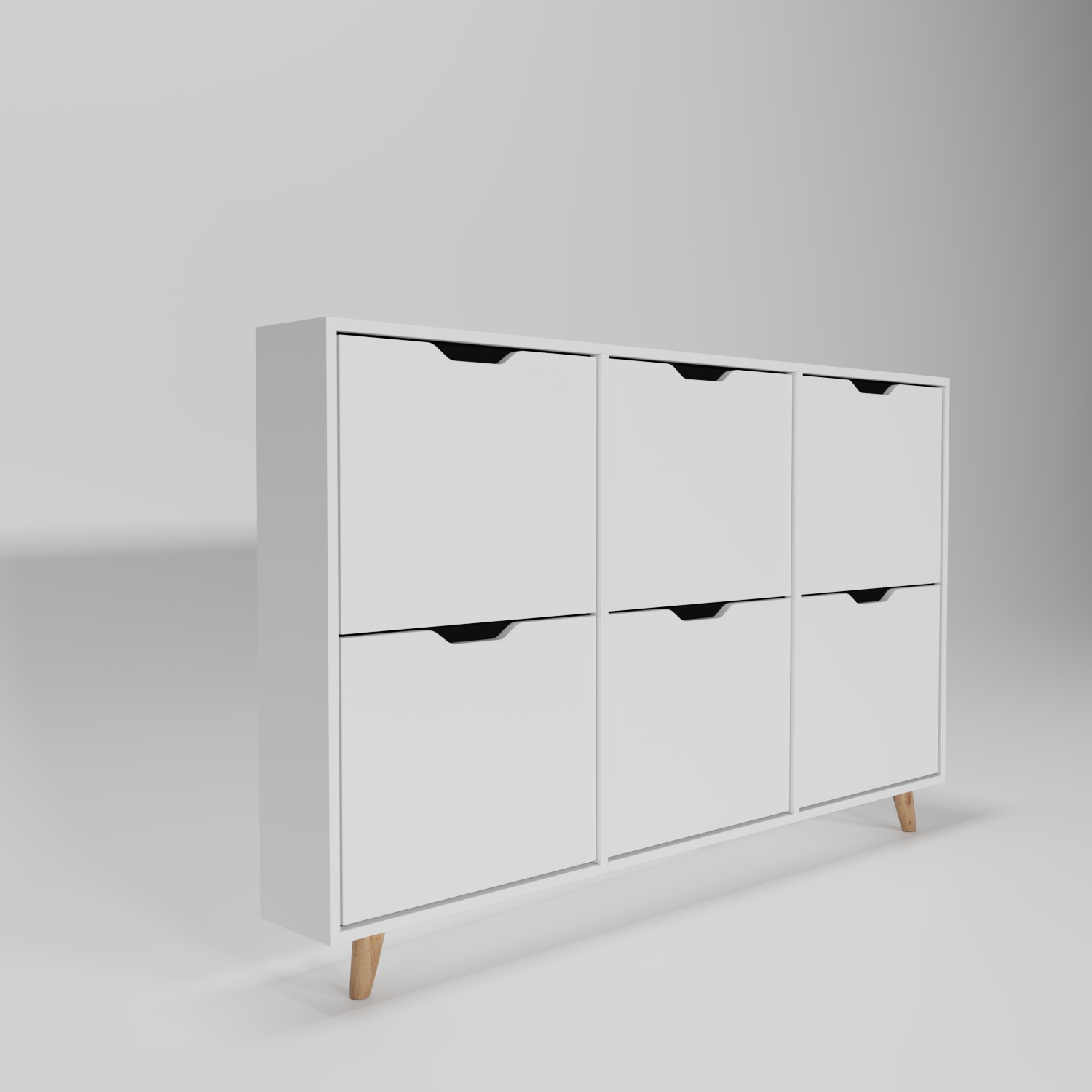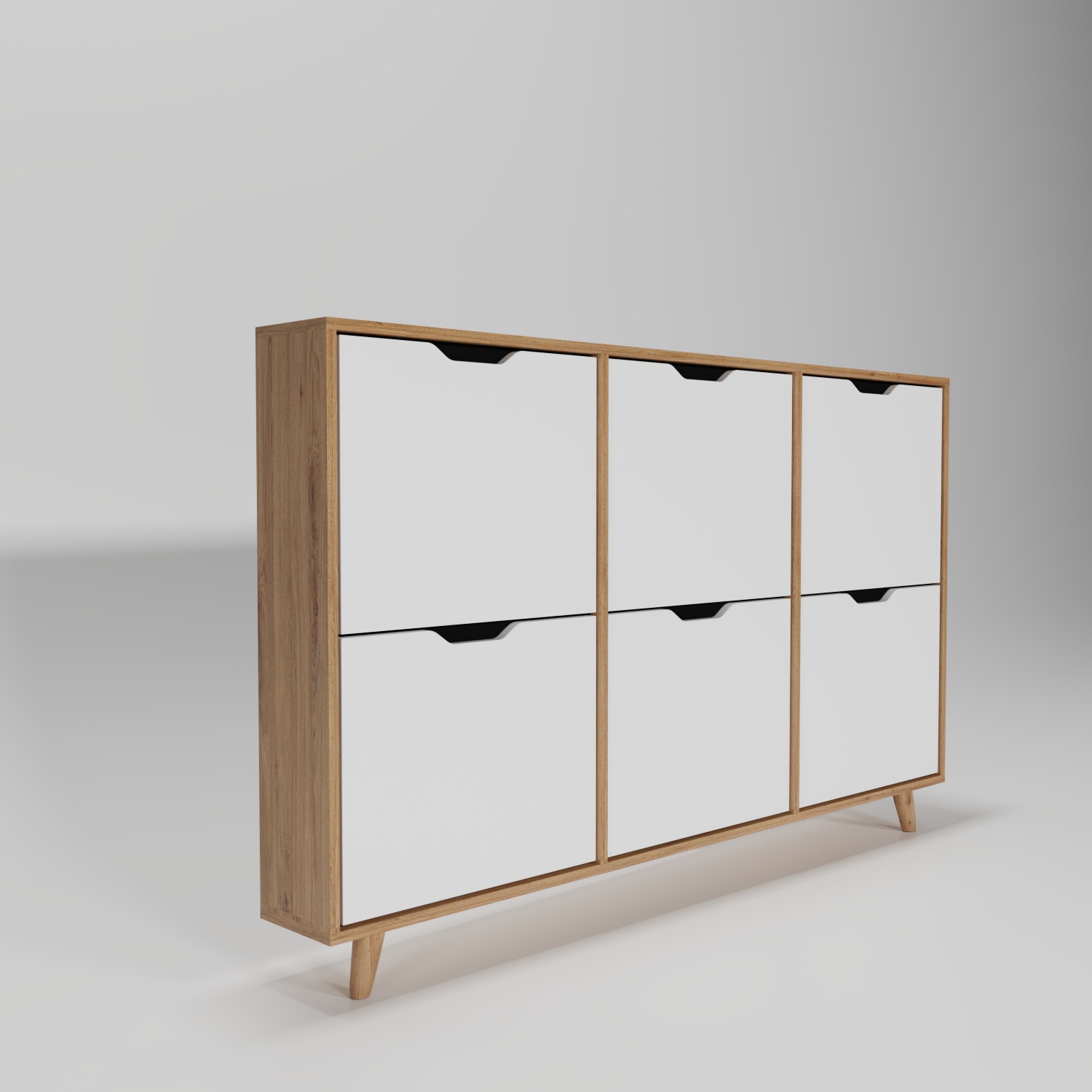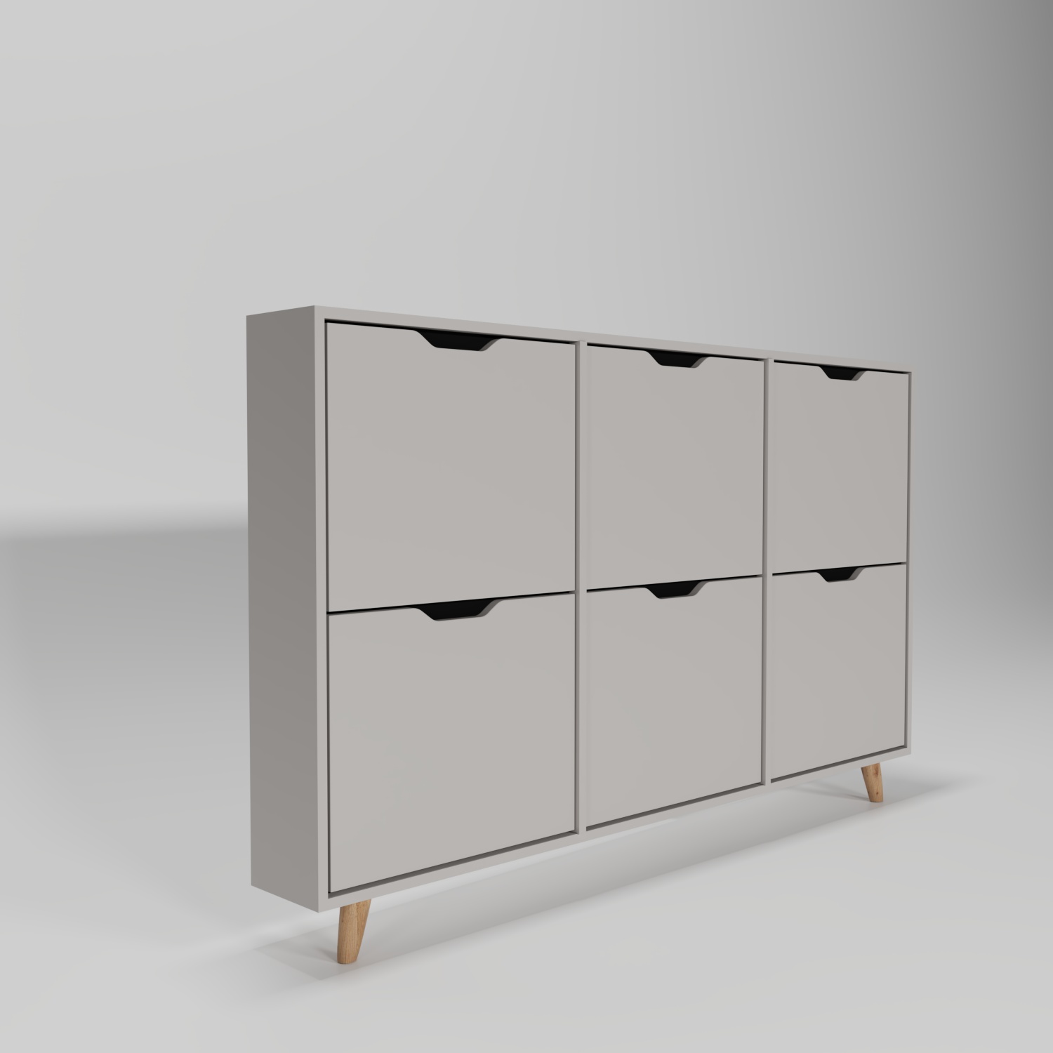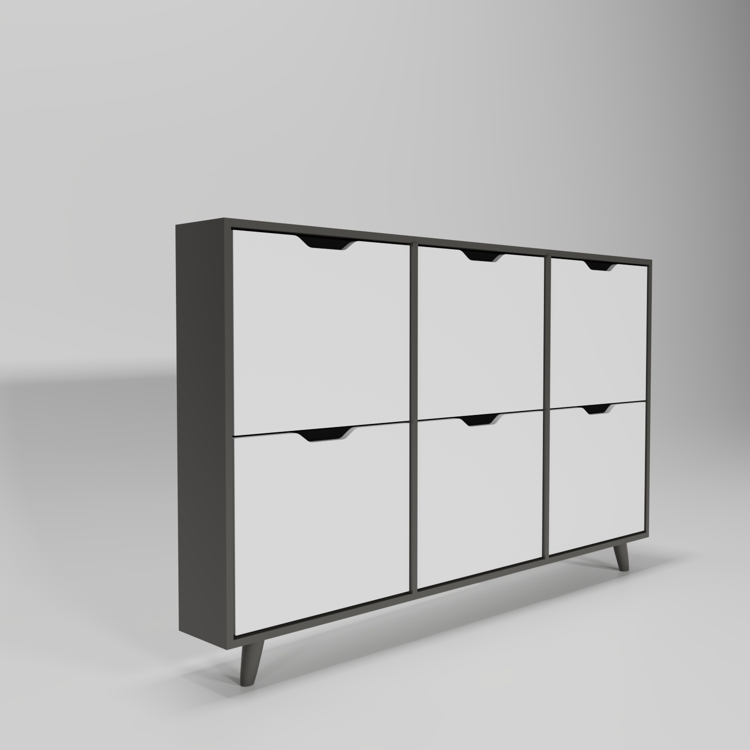 • در طراحی جاکفشی کمجا مدل رادین، فرم باریک و ۶ درب داشبوردی بهگونهای در کنار هم قرار گرفتهاند که با اشغال کمترین فضا، امکان نگهداری ۱۲ جفت کفش را بهصورت مرتب و در دسترس فراهم میکند. ظاهر ساده و مدرن این مدل، آن را به گزینهای مناسب برای ورودیهای کوچک و خانههای آپارتمانی تبدیل کرده است.